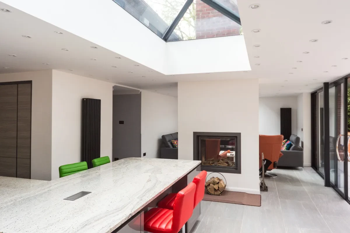 After sitting down to discuss ideas for the extension, Adenhart explained the many Ultraframe roof options which could be used to bring light into the extension and the couple decided on a large flat-roofed design featuring two large Ultrasky Lanterns at 3250mm x 1725mm in anthracite grey aluminium to complement the 9.5m aluminium sliding doors.