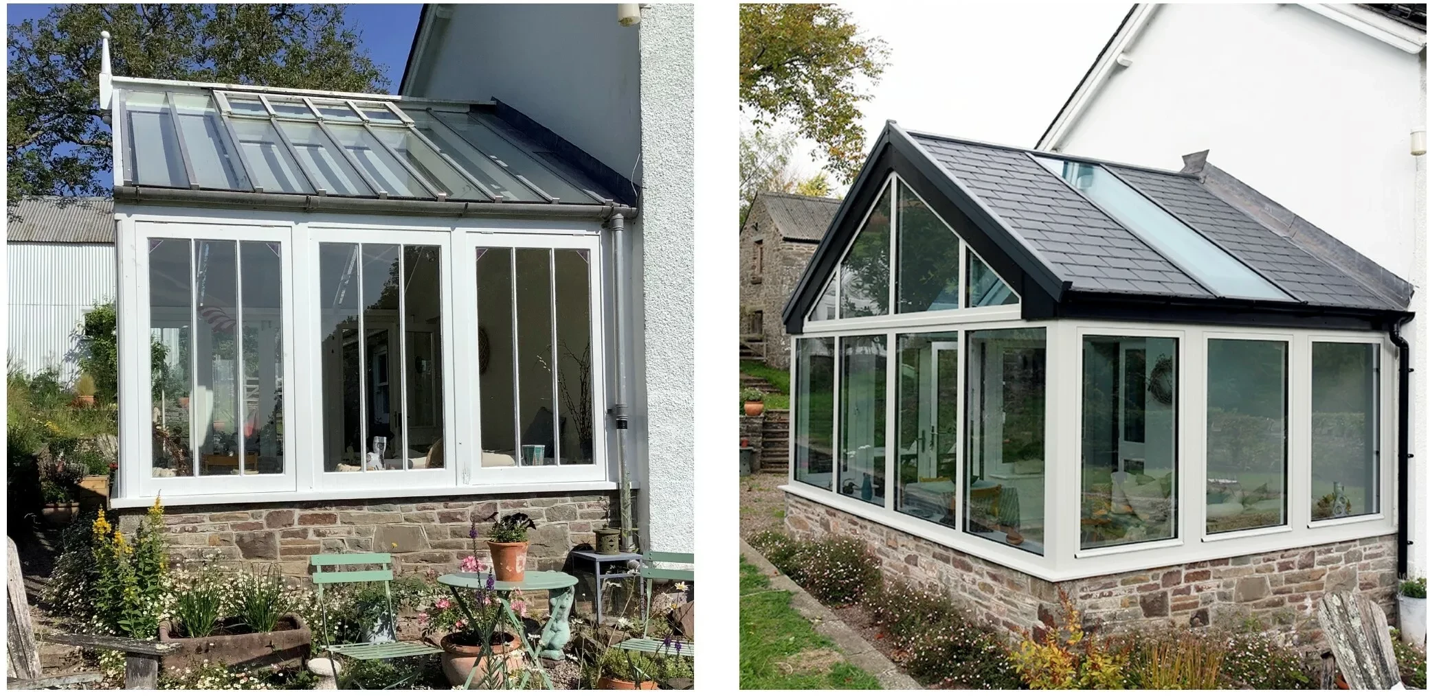 Featuring an Ultraroof tiled solid roof, the new conservatory offers a comfortable, consistent temperature and is far more energy efficient than the old structure. Ultraroof is the warmest solid roof on the market, offering unrivalled thermal performance and making it the ideal choice for a room which can be used at any time of the year. The roof features two full length glazed panels to ensure that although it offers the more substantial room-like feel that the couple wanted, it is also light and bright on the interior. The design of the new aluminium windows and doors is far simpler than the ones on the old conservatory, giving a fresh modern look, while the beautiful Agate Grey colour chosen for the frames complements the white render of the home and the natural stone dwarf walls perfectly, giving a stunning overall look to this transformation.