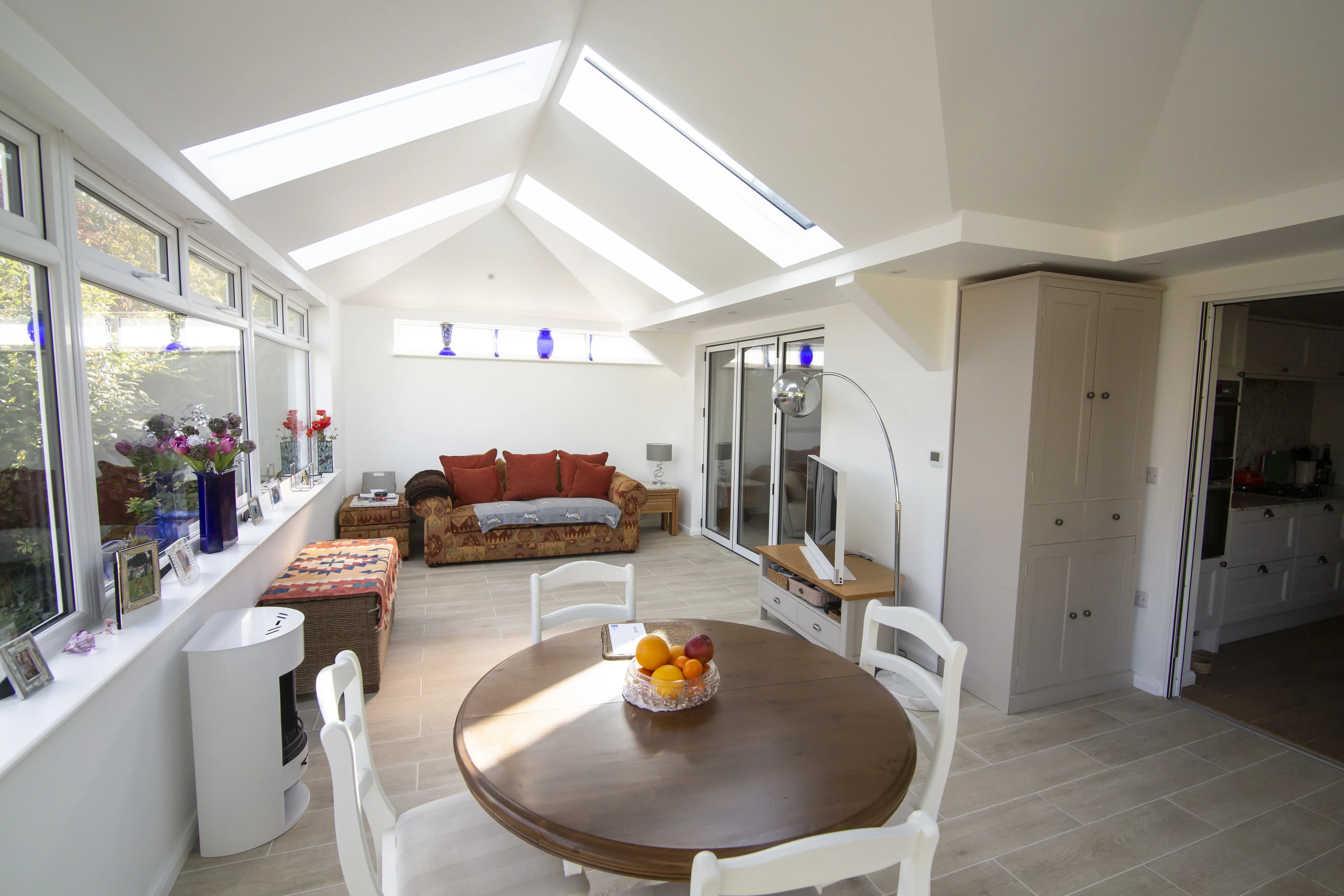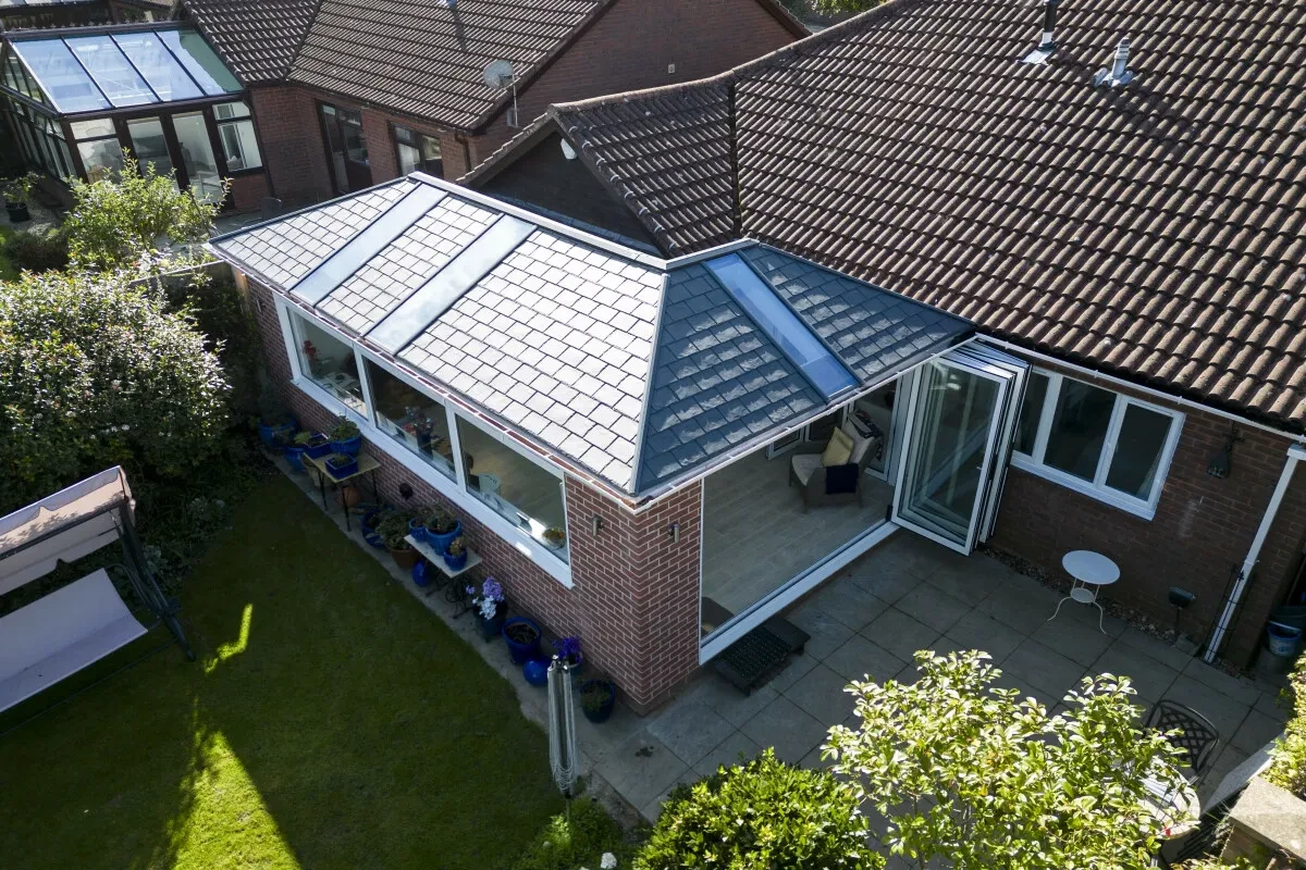 Working with her installer, Mrs Bell settled on a large wraparound design which is double the size of her old conservatory and fills much of the rear wall space of her bungalow. The new design features two sets of internal doors that lead through to the kitchen and the lounge of Mrs Bell’s home. This clever design means that her hup! extension can be open plan to the rest of her home, or made private if needed by closing the internal bi-fold doors. Linking to the garden, Mrs Bell’s hup! has a set of bi-fold doors and a large expanse of windows, meaning she can enjoy views of her garden and easily access it during the summer months. The tiled roof features five full length glazed panels to ensure that the new room below is flooded with heaps of natural light and from the inside, they add the wow factor.