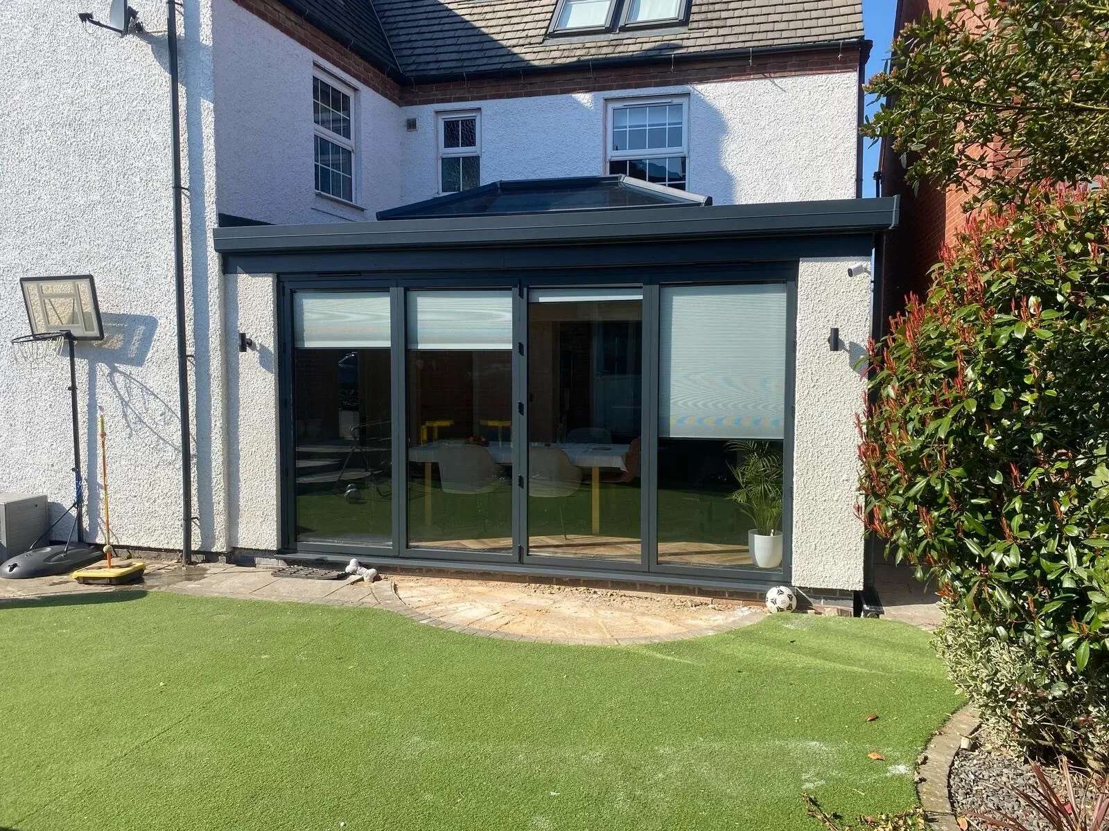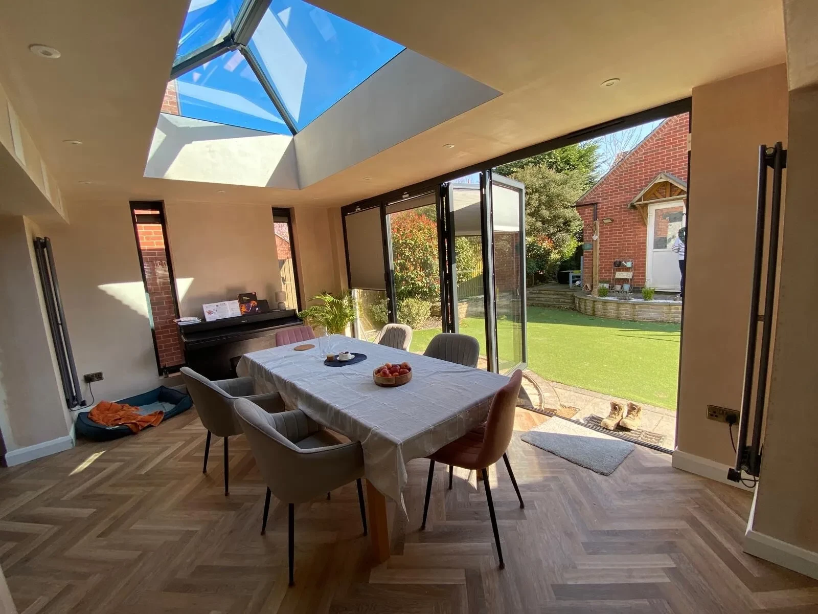 Commenting about their new living space, the couple said: “We are delighted with our hup! extension, it provides everything we were hoping for. We use it all the time and it has given us a great flow through the house. We use it as a dining area but also, the piano is in that space and so we spend more time than just eating in there. With the bi-fold doors across the width of the extension, we can open it all up to the garden which provides an inside/outside living feel. The lantern on the flat roof also provides much more light than there was before. The build went up very quickly and it took a lot less time to complete than we would have expected. After the base level blue brick went down and the main construction started, we were “knocked through” and watertight within a week!”