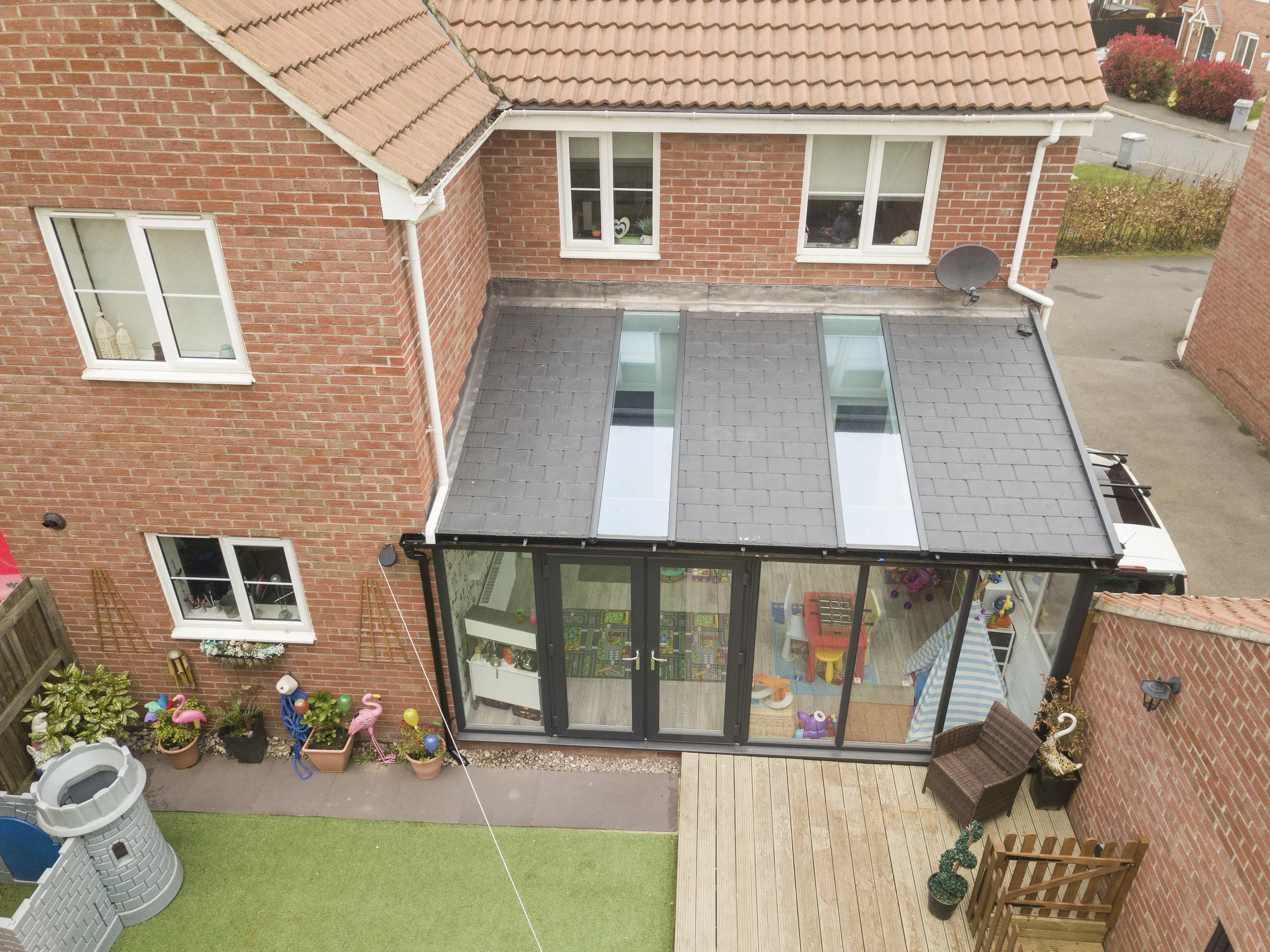 The finished extension is contemporary in style thanks to the minimalist full height frames and on-trend anthracite grey colour which is complemented perfectly by Ultraroof’s carbon grey tiles.